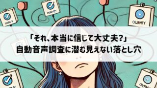 豆知識 「それ、本当に信じて大丈夫?」自動音声調査に潜む見えない落とし穴 最近よくかかってくる“自動音声のアンケート電話”。なんとなく応じてしまったこと、ありませんか?でもちょっと待ってください。その調査、本当に信じて大丈夫でしょうか?この記事では、自動音声調査に潜む見えないリスクや、私たちの心に働く心理的なトリ... 豆知識